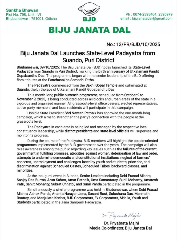 Senior BJD leaders, including party vice-president Debi Prasad Mishra, flagged off the campaign after paying floral tributes at the statues of the Pancha Sakha at Sakhigopal. The padyatra will continue from October 9 to November 9, covering all 147 Assembly constituencies and 314 blocks across the state.